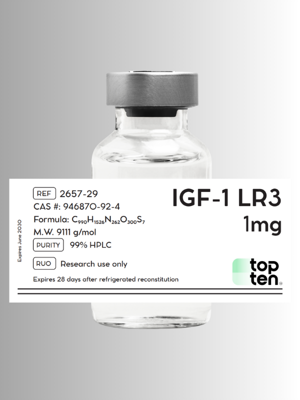 IGF-1 LR3 (Long Arg3 Insulin-like Growth Factor-1) is a synthetic peptide analog of human IGF-1, modified for increased stability and bioactivity. This modification includes the substitution of arginine at position 3 and the addition of a 13-amino acid extension to the B chain. IGF-1 LR3 has been extensively studied for its role in promoting cellular growth, repair, and metabolic efficiency. It is provided in lyophilized powder form for research applications targeting cellular regeneration, muscle development, and metabolic pathways.