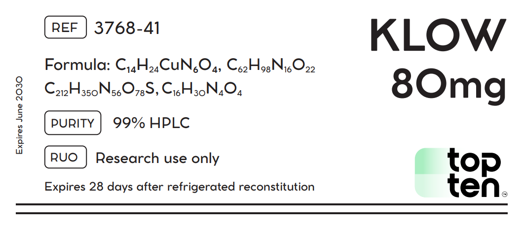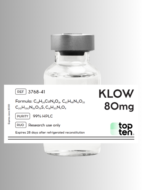The Klow Blend combines four research peptides, BPC-157, TB-500, KPV, and GHK-Cu, formulated for studies on cellular repair, immune modulation, and extracellular matrix regulation. BPC-157 is a 15 amino acid gastric peptide fragment that modulates nitric oxide and growth factor pathways. TB-500, a segment of Thymosin Beta-4, regulates actin polymerization and tissue remodeling. KPV, derived from the C-terminal region of alpha-melanocyte-stimulating hormone, modulates NF-κB and cytokine signaling. GHK-Cu, a copper(II)-complexed tripeptide, influences metalloprotein activity and redox balance. Together, these peptides are used in research examining regeneration, inflammation, and peptide–metal interaction mechanisms.