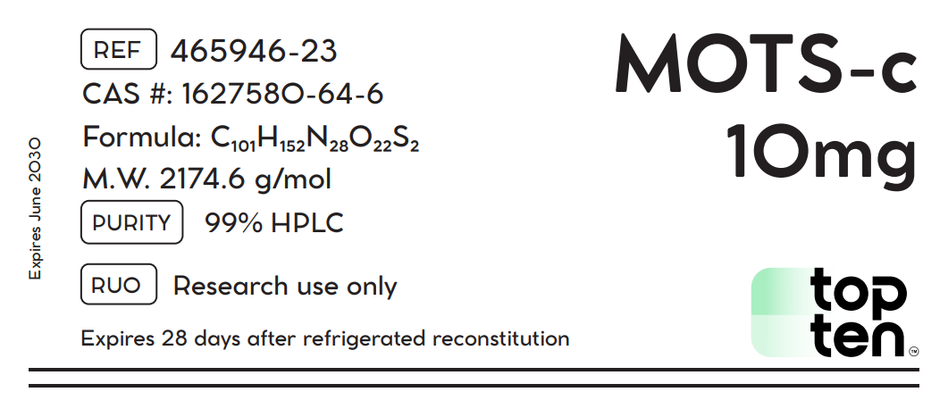 FOR LABORATORY RESEARCH USE ONLY. This product is a synthetic laboratory reagent intended strictly for in vitro and animal model research. It is not for human or veterinary use. MOTS-c is not a medication, food, or dietary supplement. The purchaser assumes all responsibility for the handling and use of this compound in a controlled, professional environment.
